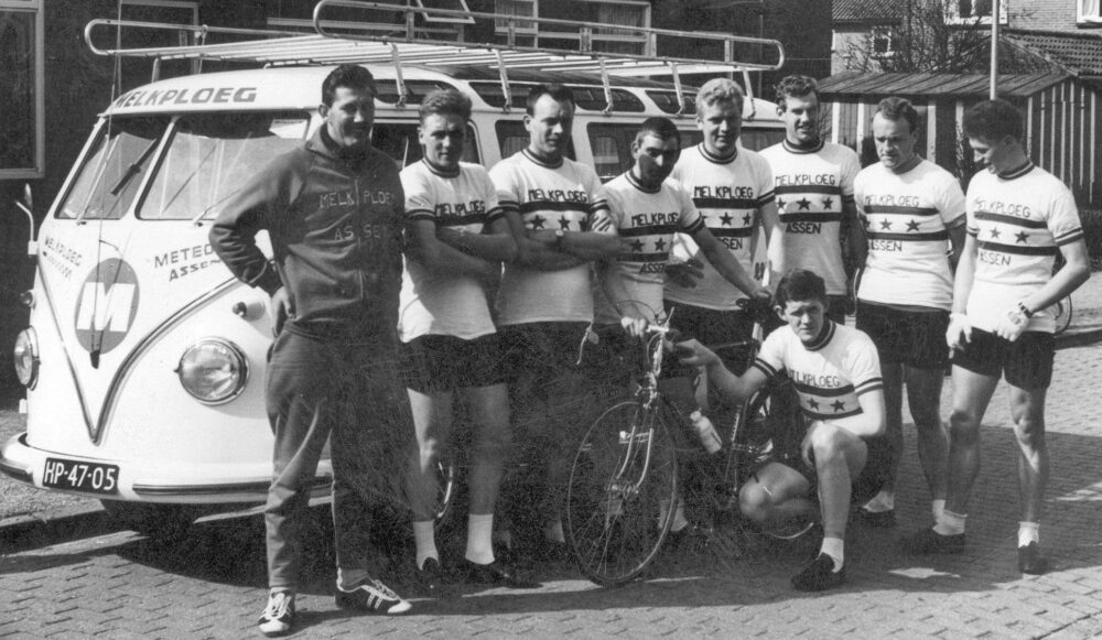 De Melkploeg van de Asser Wielerclub (AWC) de Meteoor wordt gesponsord door de zuivelfabriek Acmesa uit Assen. Links, voor de VW-ploegbus ploegleider Fré Bos, dan Herman Strijbosch, Harm Rutgers, Jo Wilkens, Jan Hendrik Koops, Dinus Vos, Bé Jansema en Pier Dijkstra; gehurkt met fiets Jan Glas. De lokatie is niet bekend.