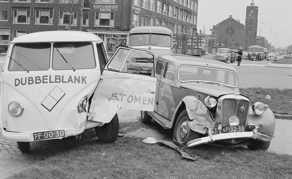 Een aanrijding tussen een Volkswagen Spijlbus en een Rover 75 P3.