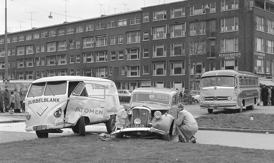 En zoals te zien is heeft de (Duitse) touringcar op de achtergrond, een Mercedes Benz O 321 H van 1954, ook schade en zal wellicht bij de aanrijding betrokken zijn geweest.