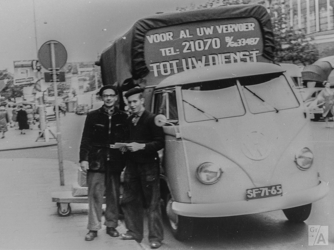 Vismarkt : Volkswagenbusje Tot Uw Dienst vervoer : met L. Venhuizen (l.) en S.W. Mollema